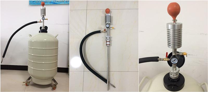 該產(chǎn)品依靠操作者手捏吸液球(YDB-5型)或者腳踏氣缸(YDB-8型),使液氮容器內(nèi)貯存的液氮少量產(chǎn)生氣化。由于液氮的氣液體積比較大,氣化后的氮?dú)庠诿芊獾娜萜鲀?nèi)對(duì)盛裝的液氮增壓,促使容器內(nèi)盛裝的液氮排放出來(lái),達(dá)到對(duì)其它容器補(bǔ)充液氮的目的。它具有操作方便可靠、排液過(guò)程中液氮的蒸發(fā)損失低的優(yōu)點(diǎn)。